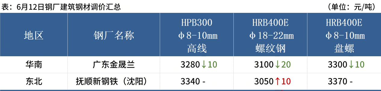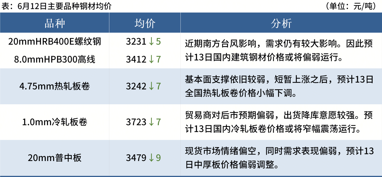 ◎ 6月12日,國(guó)內(nèi)鋼材市場(chǎng)震蕩偏弱運(yùn)行,唐山遷安普方坯出廠含稅下跌30報(bào)2890元/噸。