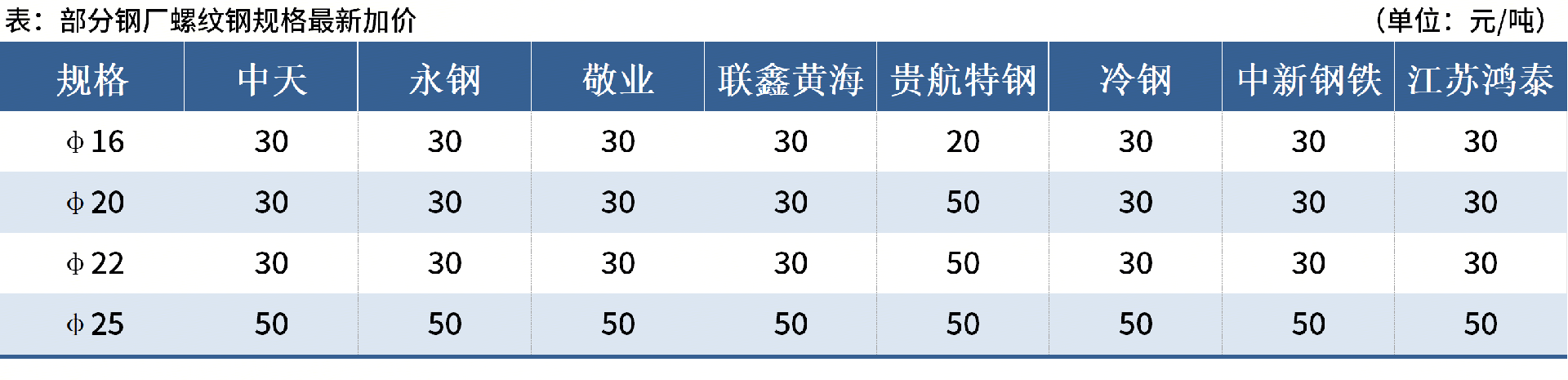 ◎近日部分鋼廠陸續(xù)公布通知,決定對螺紋鋼(棒)相關(guān)規(guī)格加價進行調(diào)整: