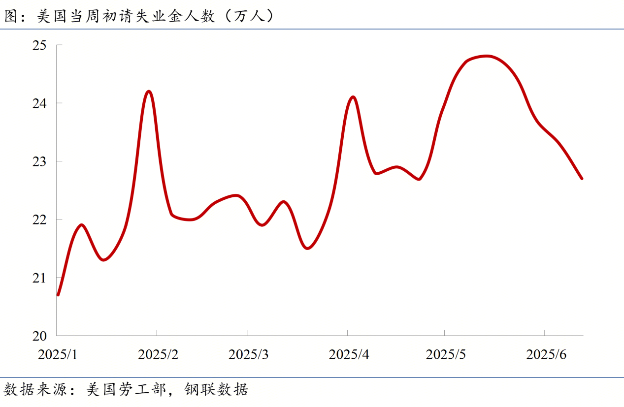 ◎ 美國勞工部公布的數(shù)據(jù)顯示,截至7月5日當(dāng)周,初請失業(yè)金人數(shù) 22.7萬人,預(yù)期23.5萬人。美國申請失業(yè)金的人數(shù)在連續(xù)第四周下降后,已降至兩個月來的最低水平。