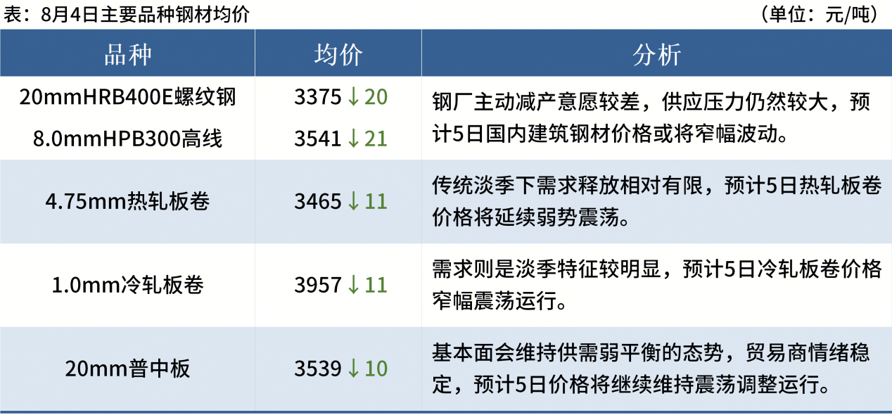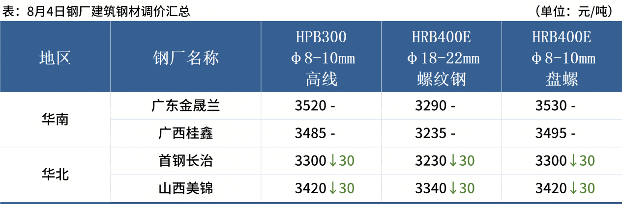 ◎ 8月4日,唐山遷安普方坯資源出廠含稅上調(diào)20,報(bào)3050元/噸。