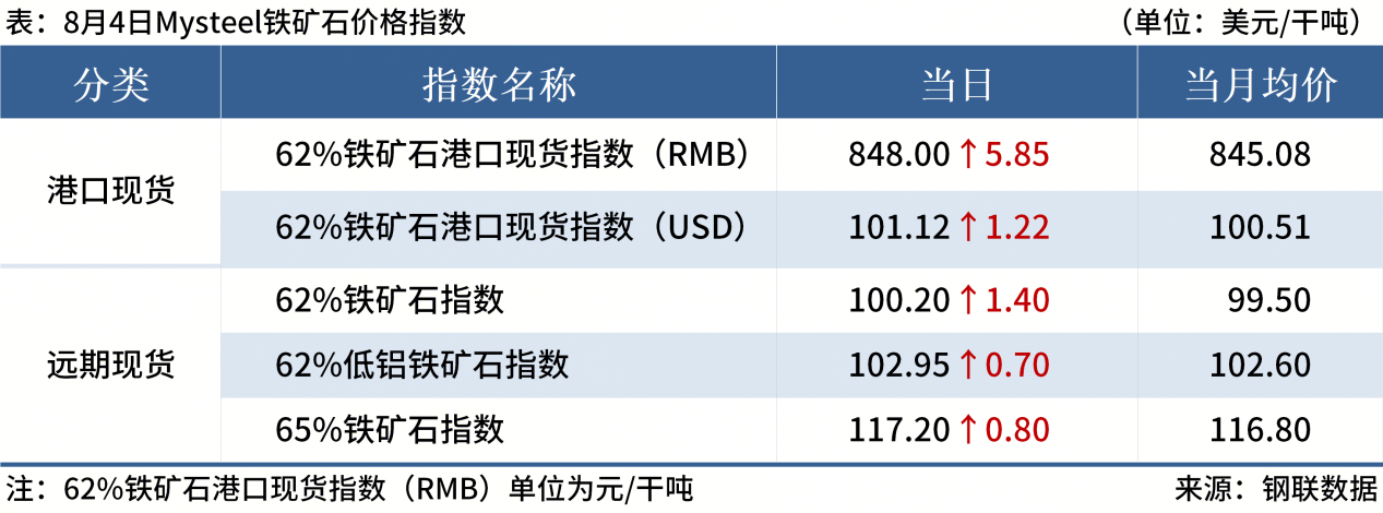 ◎ 8月4日,Mysteel進(jìn)口鐵礦石62%澳洲粉礦遠(yuǎn)期現(xiàn)貨指數(shù)100.2美元/干噸,漲1.4美元/干噸,月均99.5美元/干噸;65%巴西粉礦遠(yuǎn)期現(xiàn)貨指數(shù)117.2美元/干噸,漲0.8美元/干噸,月均116.8美元/干噸。