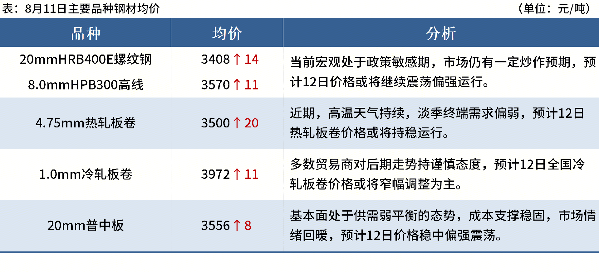 ◎8月11日,寶鋼9月冷熱軋調(diào)價,厚板、熱軋基價上漲200元/噸;酸洗、普冷基價上漲300元/噸。詳情>>