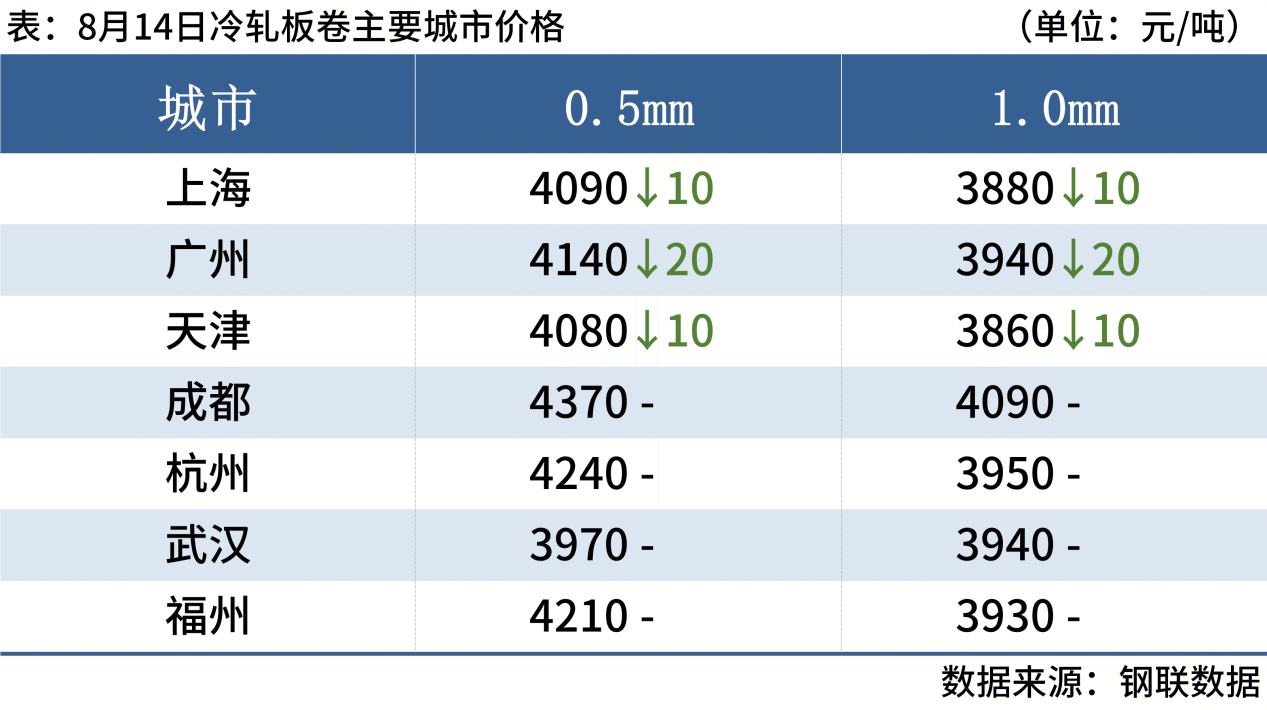 冷軋板卷:8月14日,全國(guó)24個(gè)主要城市1.0mm冷卷均價(jià)3993元/噸,較上個(gè)交易日跌4元/噸。市場(chǎng)情緒較為謹(jǐn)慎,交投活躍度不佳,商家出貨受阻,小幅下調(diào)現(xiàn)貨價(jià)格。本周冷軋板卷整體庫(kù)存壓力依舊不大。大部分商家認(rèn)為在維持當(dāng)前較低庫(kù)存水平狀態(tài)下,短期內(nèi)冷軋板卷現(xiàn)貨價(jià)格向下調(diào)整空間有限。綜合來(lái)看,預(yù)計(jì)15日冷軋價(jià)格或?qū)⒄鹗幷{(diào)整運(yùn)行為主。