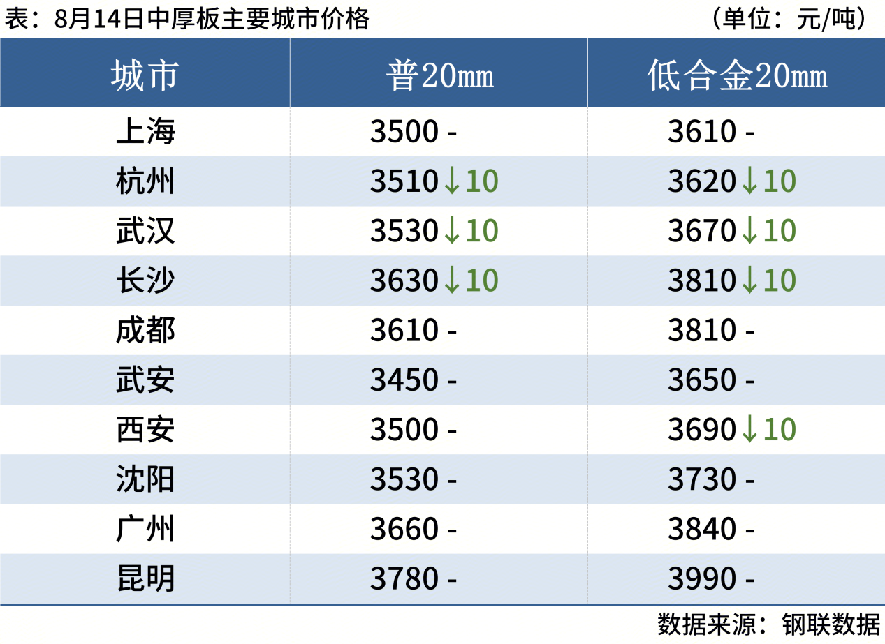 中厚板:8月14日,全國(guó)24個(gè)主要城市20mm普板均價(jià)3569元/噸,較上一交易日跌3元/噸。目前多數(shù)中板廠普板資源排產(chǎn)較少,大多數(shù)以品種鋼、錳板、定軋資源優(yōu)先發(fā)貨,市場(chǎng)流通材一直打折,市場(chǎng)庫(kù)存偏少。就華東區(qū)域來(lái)看,整體出貨較差。尤其普板,目前市場(chǎng)普板大多出現(xiàn)缺貨缺規(guī)格現(xiàn)象,現(xiàn)普板主要來(lái)源以北方鋼廠為主,低合金出貨較為正常。綜合來(lái)看,淡季需求疲軟,但基本面處于供需弱平衡的態(tài)勢(shì),預(yù)計(jì)15日全國(guó)中厚板價(jià)格震蕩運(yùn)行。
