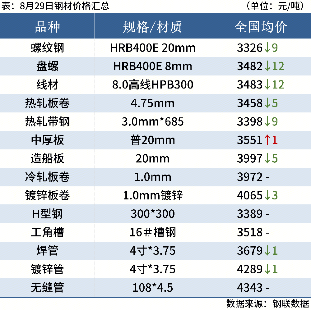 螺紋鋼:8月29日,全國31個主要城市20mm三級抗震螺紋鋼均價3326元/噸,較上個交易日跌9元/噸。短期來看,供需基本面矛盾逐步累加,預(yù)計下周國內(nèi)建筑鋼材價格或?qū)⒀永m(xù)偏弱震蕩運行態(tài)勢。