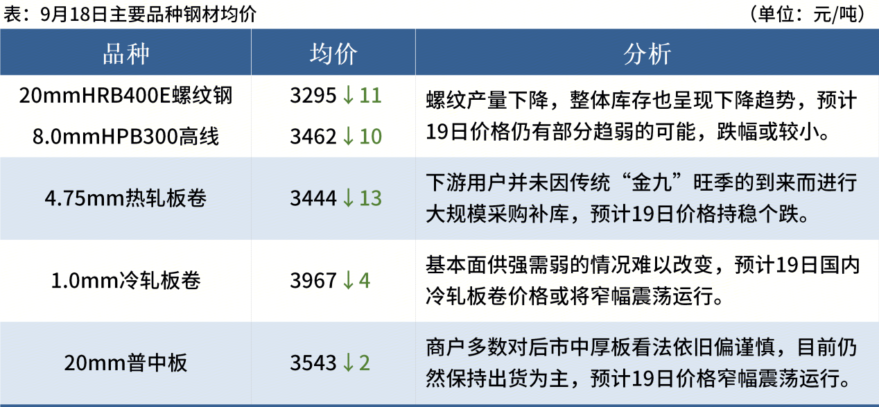 ◎ 9月18日,全國(guó)主港鐵礦石成交97.40萬(wàn)噸,環(huán)比減23%;237家主流貿(mào)易商建筑鋼材成交8.78萬(wàn)噸,環(huán)比減14.5%。