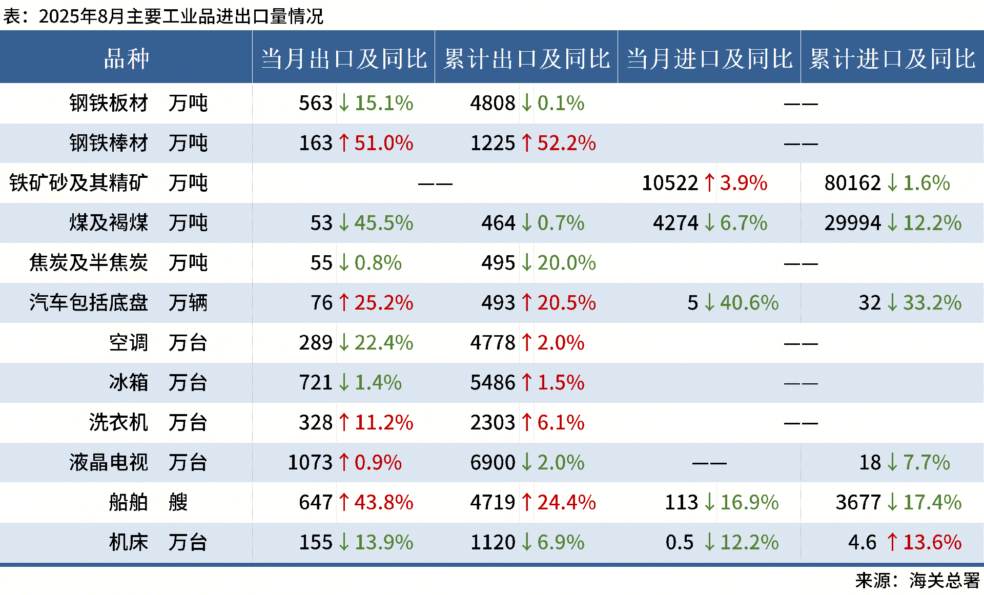 ◎ 海關(guān)總署:8月,中國(guó)出口鋼鐵板材563萬(wàn)噸,同比降15.1%;8月,中國(guó)出口棒材163萬(wàn)噸,同比增51%。其他主要工業(yè)品進(jìn)出口情況如下:
