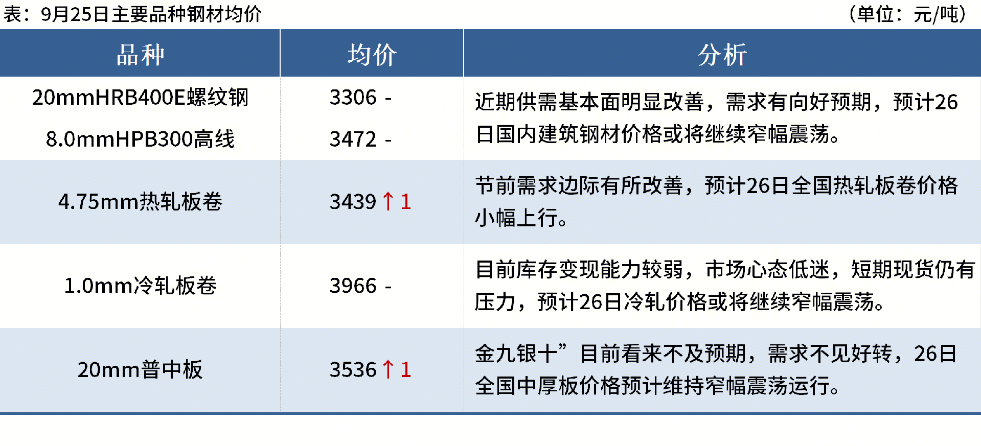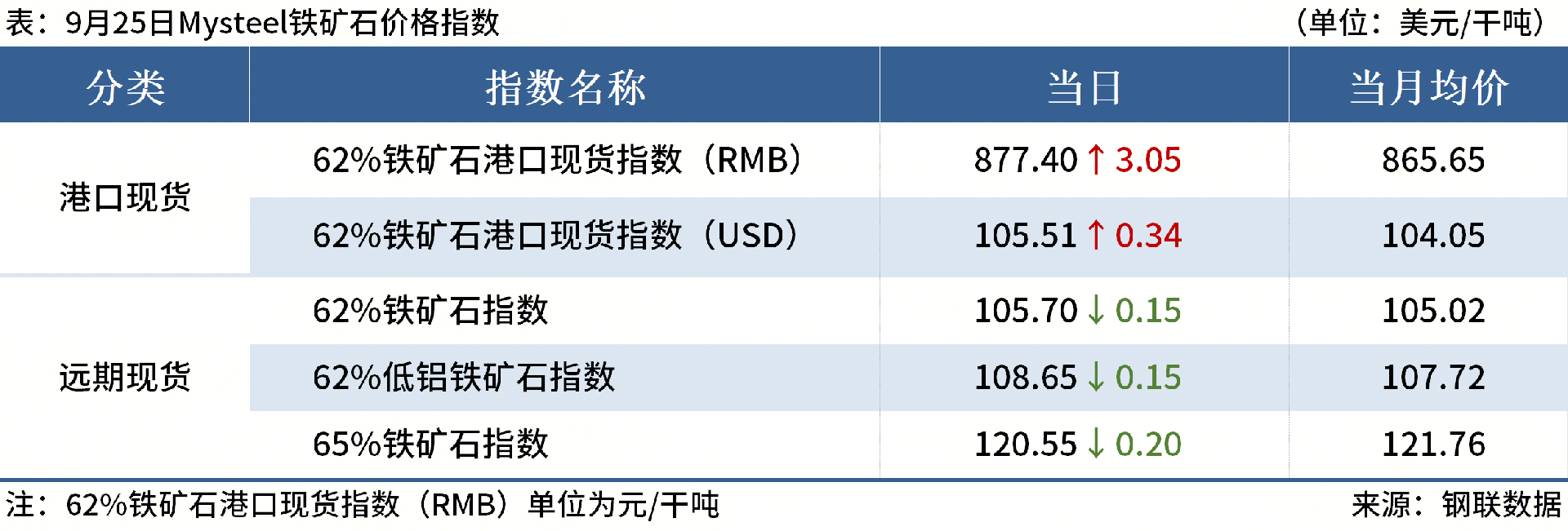 ◎9月25日,全國主港鐵礦石成交111.10萬噸,環(huán)比減28.3%;237家主流貿(mào)易商建筑鋼材成交10.82萬噸,環(huán)比增4.1%。