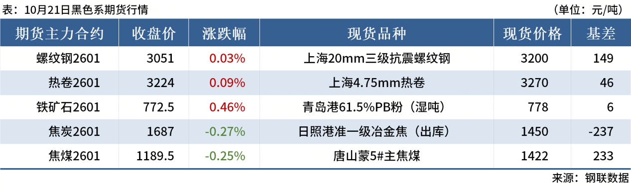 ◎10月21日,全國主港鐵礦石成交101.10萬噸,環(huán)比增19.8%;237家主流貿(mào)易商建筑鋼材成交10.12萬噸,環(huán)比增3.5%。