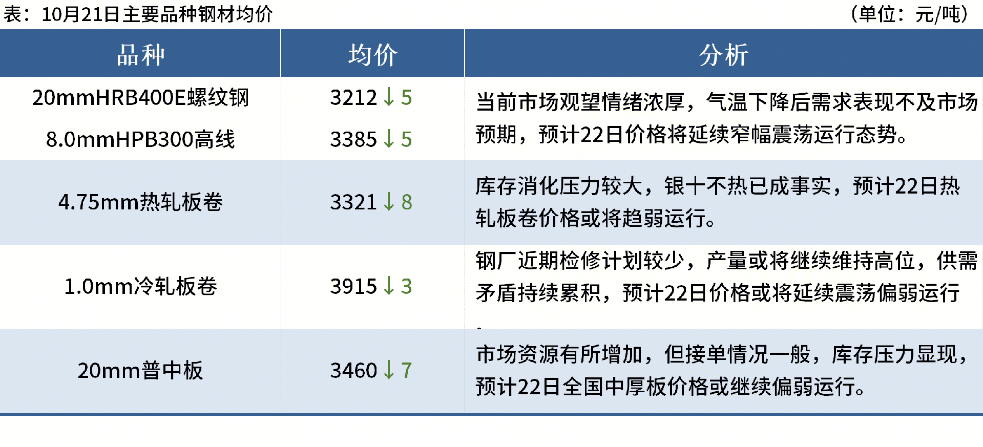 ◎10月21日,江蘇永鋼出臺10月下旬出廠價,螺紋鋼下調(diào)50元/噸、線材盤螺下調(diào)50元/噸,現(xiàn)螺紋鋼3400元/噸,線材盤螺3600元/噸。